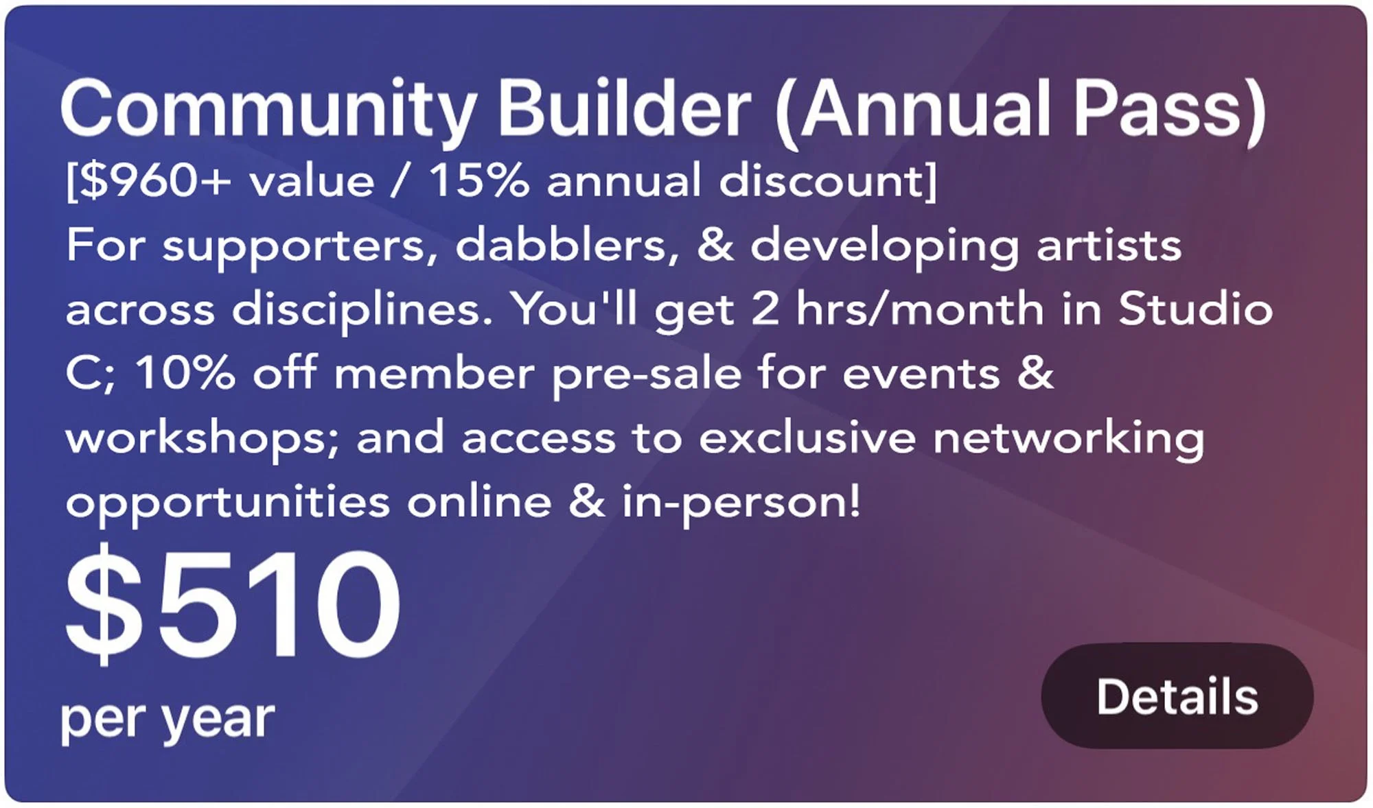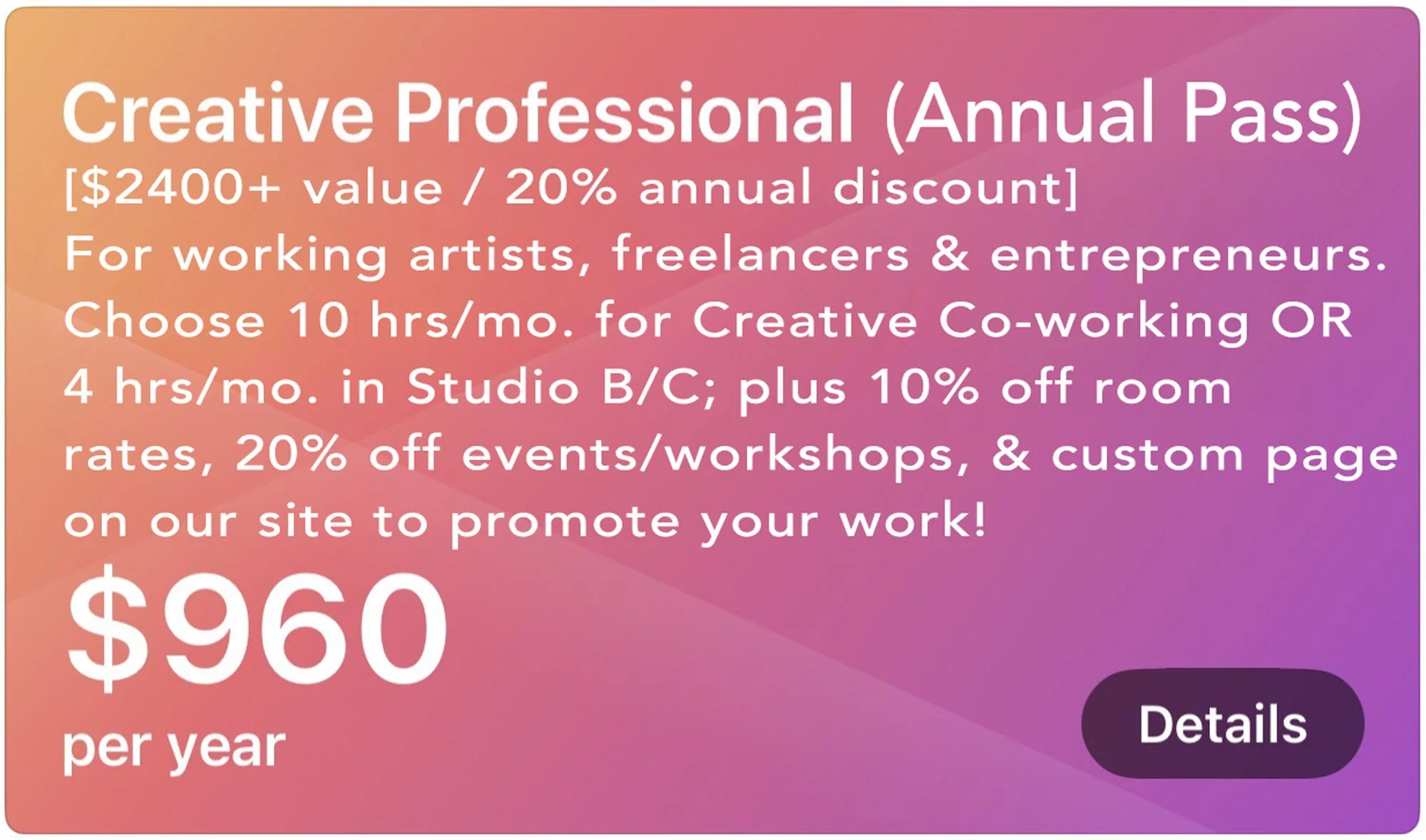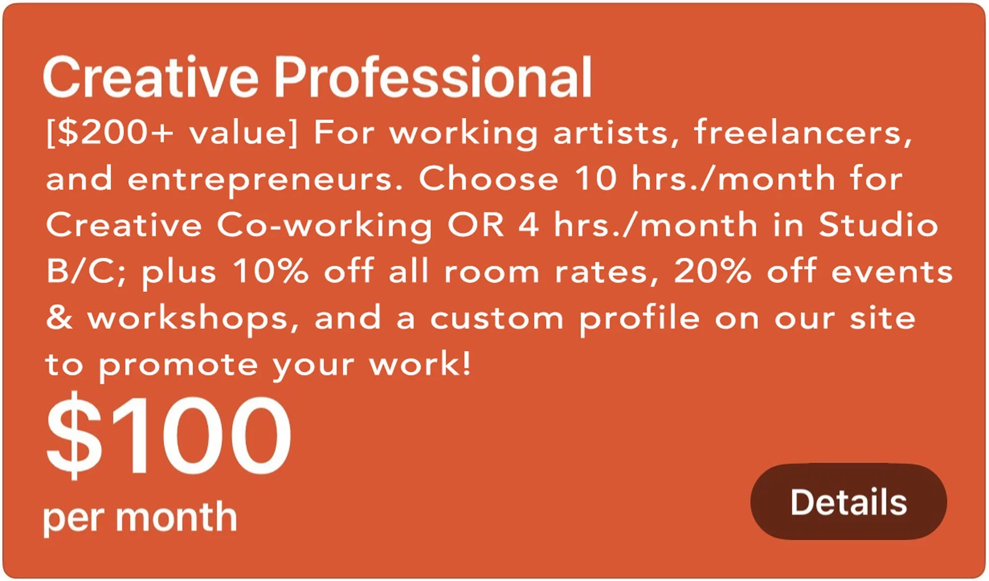 2 hrs./month: Sessions in Studio C (great for podcasts, photo & video content production, and rehearsals/recording with 1-4 people)