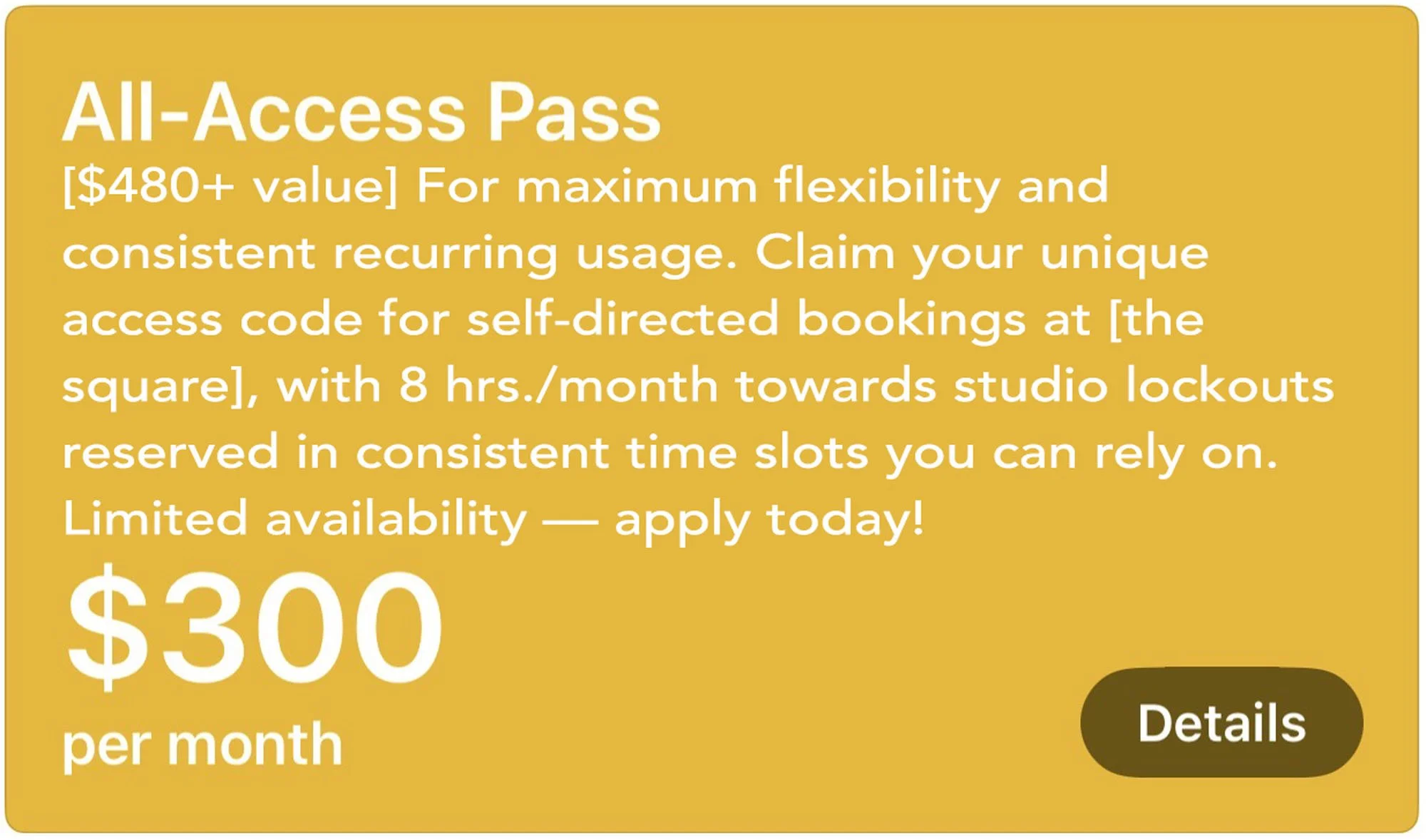 8 hrs./month: Studio lockouts reserved in consistent time slots for recurring access